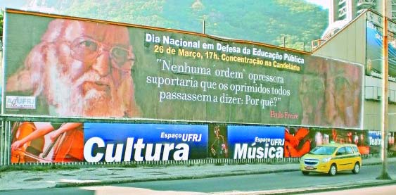 O mais novo outdoor da Seção Sindical dos Docentes da UFRJ (Adufrj-SSind) faz uma homenagem ao educador Paulo Freire (1921-1997), atacado em uma faixa das manifestações de 15 de março. No painel, localizado na zona sul da cidade, ao lado do ex-Canecão, é destacada uma de suas expressões, do livro “Pedagogia do Oprimido”: “Nenhuma ‘ordem’ opressora suportaria que os oprimidos todos passassem a dizer: ‘Por quê?’”.