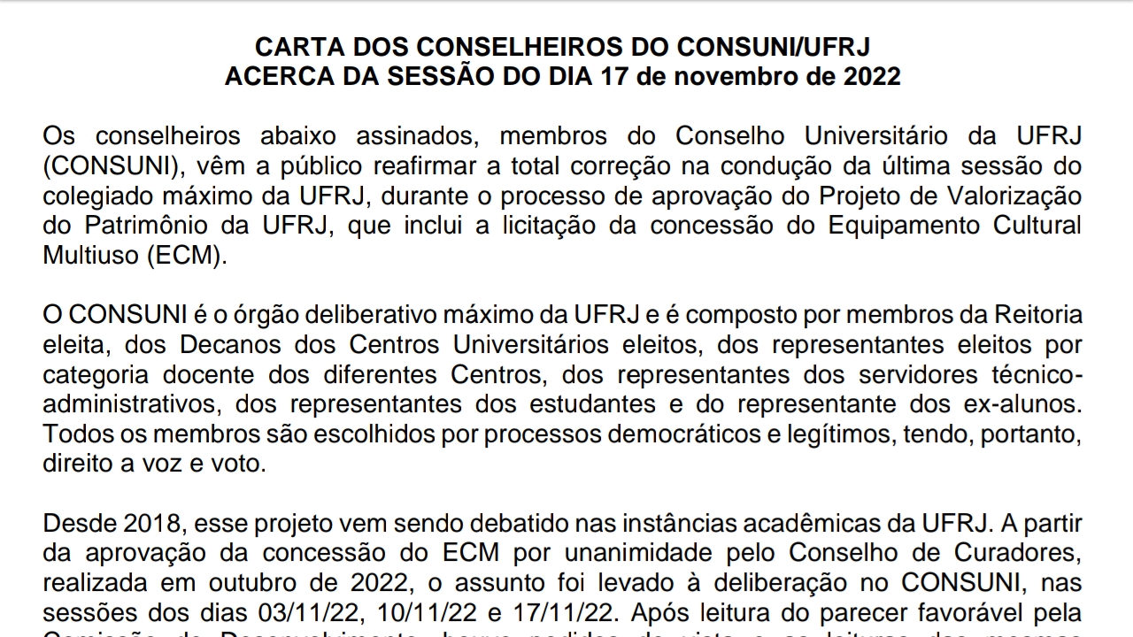 Cinquenta e um integrantes do Conselho Universitário divulgaram uma carta aberta em que reafirmam a autonomia e representatividade do colegiado máximo da UFRJ. O documento havia sido assinado, inicialmente, por 46 conselheiros no dia 21, mas alguns suplentes quiseram se somar ao movimento nos últimos dias.