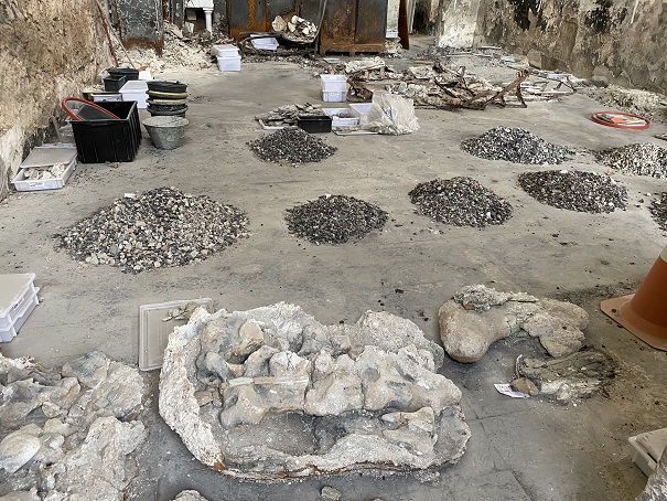 Um dos lotes contém o esqueleto parcial do Dinossauro do Mato Grosso, um fóssil com aproximadamente 80 milhões de anos, pertencente ao período Cretáceo, resgatado das ruínas neste ano. Os dois blocos com vértebras articuladas e outros ossos associados foram encontrados praticamente intactos. Aparentemente, segundo os pesquisadores, o soterramento protegeu os ossos do contato direto com o fogo. Além disso, eles chegaram à conclusão que a substituição mineral, pela qual os ossos passaram durante o processo de fossilização, possa ter sido um fator importante para a resistência ao soterramento.