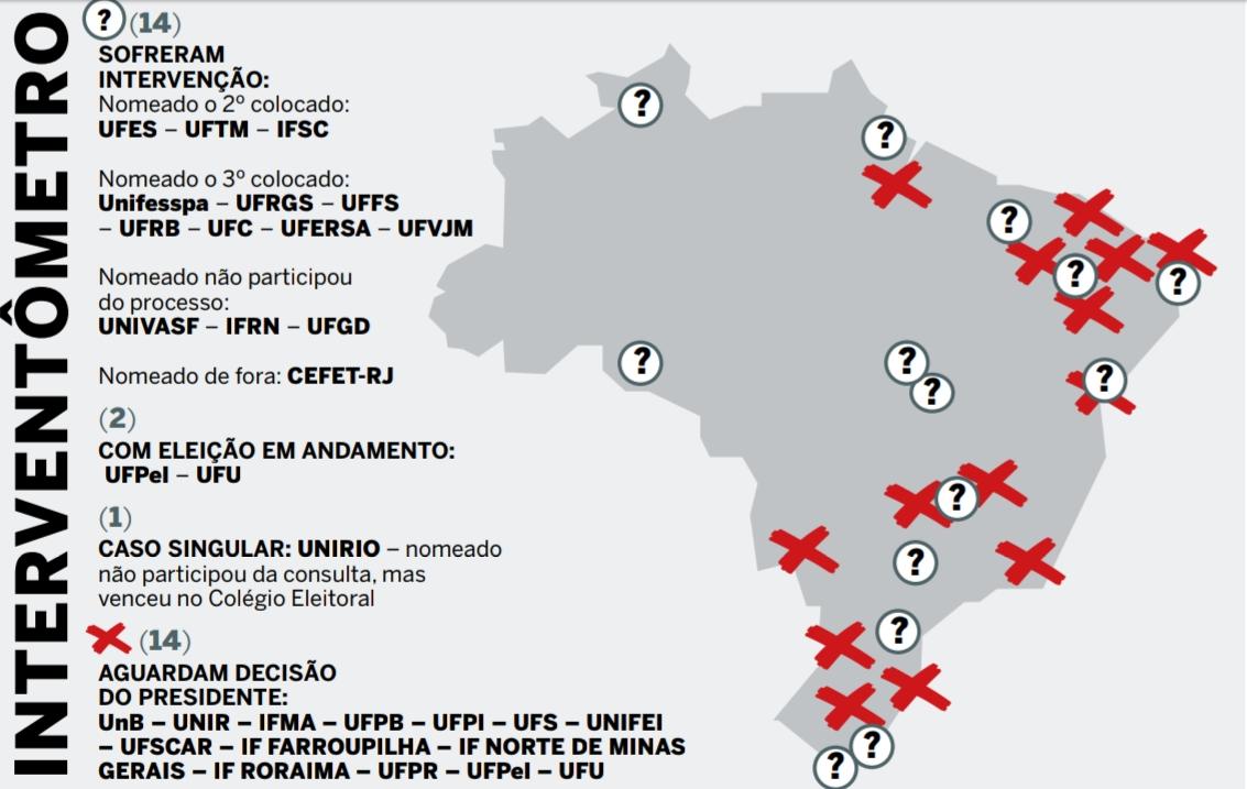 A escolha da reitoria da Universidade Federal de São Carlos virou novela. A 2ª Vara Federal da cidade paulista suspendeu temporariamente a lista tríplice indicada pela instituição. A sentença questiona o procedimento que antecedeu a formação da lista. Na ação ajuizada pelos docentes da chapa menos votada no pleito — não alcançaram sequer 10% dos votos —, o argumento é que seus nomes não foram incluídos na lista tríplice e que a consulta não respeitou o peso de 70% para o voto dos docentes. Cabe recurso. Mas, como o mandato da atual gestão termina em 8 de novembro, há o receio na UFSCar que Bolsonaro nomeie um interventor enquanto não se resolve a questão judicial.