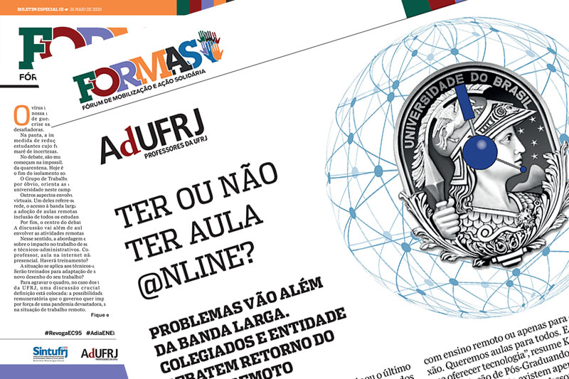 A terceira edição do boletim FORMAS, do Fórum de Mobilização e Ação Solidária da universidade, foi lançada no dia 26 de maio. O grupo reúne representantes da AdUFRJ, do Sintufrj, da Attufrj e as entidades estudantis DCE e APG. O número traz o debate sobre ensino e trabalho remoto e as preocupações com as desigualdades aprofundadas pela pandemia.