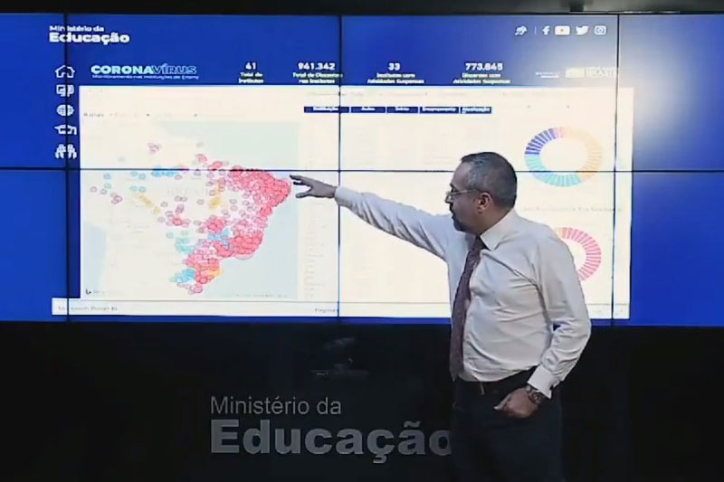 Em um mapa do país, as universidades que não retomaram os cursos de graduação apareciam como pontos vermelhos. Weintraub faz piada dizendo que “vai sumir esse vermelho aqui em mais uma ou duas semanas”. Mais uma piada ideológica de um ministro que está mais preocupado em criar polêmica no Twitter do que em fazer o ministério funcionar. Detalhe: a cor das instituições com aulas suspensas mudou para lilás.