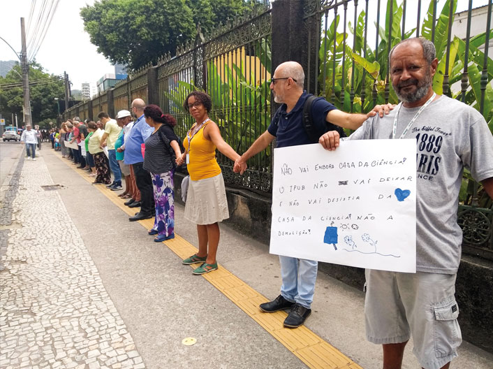 ABRAÇO ocupou todo o gradil da Casa da Ciência, em Botafogo - Foto: Elisa MonteiroCerca de cem pessoas participaram de um abraço à Casa da Ciência na manhã de quarta-feira, dia 30. A manifestação é contra uma eventual demolição do imóvel em função do Viva UFRJ, projeto que trata dos ativos imobiliários da universidade. E segue na esteira do movimento #FicaIpub. “Podemos ampliar o que já fazemos e não pôr abaixo instituições que estão funcionando e atendendo à população”, criticou a professora Maria Tavares, do Instituto de Psiquiatria.