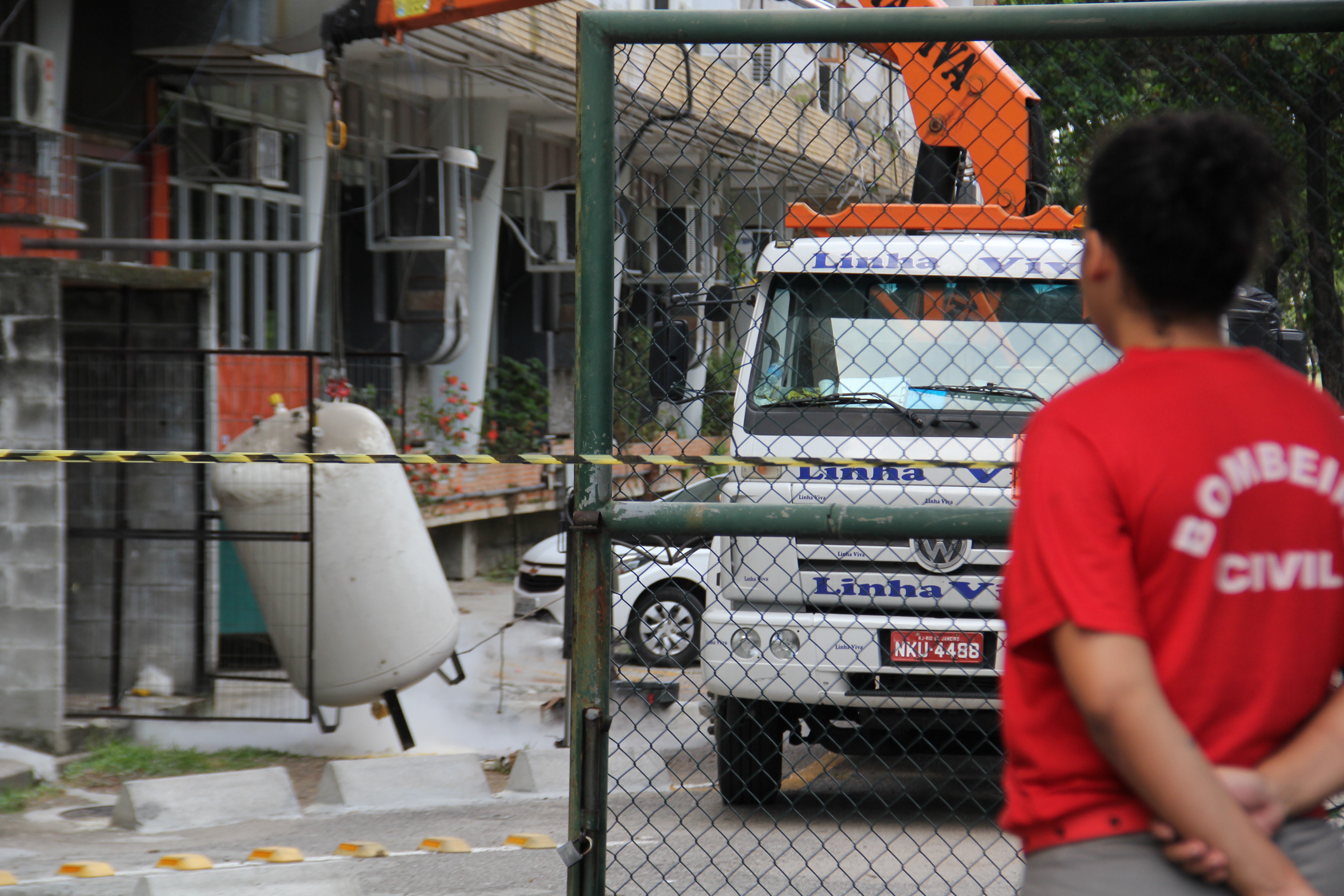 Um vazamento de gás de cozinha provocou a evacuação de todo o Bloco H do Centro de Tecnologia na tarde desta quarta-feira (27). Não houve feridos. Um vazamento de gás provocou a evacuação de todo o Bloco H do Centro de Tecnologia na tarde desta quarta-feira (27). Um cilindro cheio, com capacidade para 500 kg de gás, sofreu uma queda durante uma tentativa de remoção. A válvula de segurança, que deveria travar a saída do GLP (gás de cozinha), não funcionou. O cilindro alimentava o restaurante Burguesão. A brigada de incêndio do CT foi chamada após o forte cheiro invadir as salas do segundo andar do bloco. Houve imediata evacuação do prédio. Não houve feridos. O quartel de bombeiros militares do Fundão também foi acionado. O bombeiro civil Carlos Eduardo Machado, que integra a brigada de incêndio do CT, explicou que havia possibilidade de incêndio e risco de intoxicação por inalação do gás. "Por isso isolamos todo o perímetro para evitar danos às pessoas", afirmou. Quem precisava retirar os carros do estacionamento tinha o veículo empurrado até uma área segura. "Qualquer centelha pode provocar uma explosão", alertou Machado. A operação de esvaziamento do cilindro, para posterior remoção, durou mais de três horas.