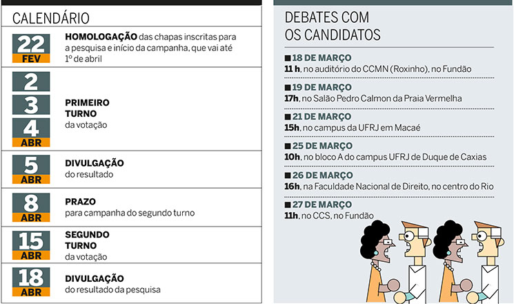A pesquisa com a comunidade universitária para escolher reitor e vice-reitor da UFRJ terá segundo turno e será paritária, ou seja, com representação igual de professores, técnicos e alunos. A pesquisa com a comunidade universitária para escolher reitor e vice-reitor da UFRJ terá segundo turno e será paritária, ou seja, com representação igual de professores, técnicos e alunos. Estas foram algumas das regras aprovadas pelo Conselho Universitário extraordinário realizado na última terça-feira, 19. O primeiro turno da pesquisa está marcado para os dias 2, 3 e 4 de abril. O Consuni aceitou quase integralmente o texto proposto pela Comissão Coordenadora da Pesquisa (CCP), que praticamente atualiza as regras da votação passada, em 2015. Mesmo motivo de polêmica, a paridade foi aprovada por ampla maioria no Consuni, com 10 votos contrários. Historicamente, as consultas na UFRJ têm sido paritárias. No entanto, a paridade começou a motivar questionamentos depois que uma nota técnica do MEC de dezembro de 2018 determinou que as consultas vinculadas às universidades sigam a legislação. No Colégio Eleitoral, 70% dos votos são de docentes, 15% de estudantes e 15% de técnicos. Do Colégio Eleitoral sai a lista tríplice a ser enviada ao presidente da República, que por sua vez indicará um nome para a reitoria. O professor Nelson Braga, representante dos professores Titulares do CCMN (Centro de Ciências Matemáticas e da Natureza), apresentou no Consuni a proposta para que a consulta repetisse os 70/15/15. Segundo ele, uma consulta diferente disso pode ser questionada num momento em que a universidade é alvo de ataques seguidos. O Consuni entendeu, porém, que a consulta é desvinculada das instâncias universitárias e por isso não precisa seguir os 70/30. O reitor Roberto Leher apresentou aos conselheiros o parecer da Procuradoria da Universidade sustentando a desvinculação. Técnicos e estudantes se posicionaram pela paridade. Os docentes estavam divididos. O professor Ericksson Almendra, da Escola Politécnica, questionou o fato de a pesquisa, mesmo entendida como desvinculada do Consuni, precisar ser aprovada pelo mesmo. “Pode este Conselho aprovar algo que a lei não permite?”, indagou. Almendra questionou o fato de a CCP, instalada com atraso pela reitoria, só ter começado a trabalhar este mês, o que reduziu o tempo de debates com a comunidade universitária. OUTRAS REGRAS Chapas que não participarem da pesquisa podem se inscrever direto no Colégio Eleitoral. Candidatos a reitor e vice-reitor que estiverem em cargo de direção ou função gratificada, na UFRJ ou nas Fundações de Apoio da universidade, são obrigados a se desincompatibilizar. Estão proibidas contribuições financeiras de empresas, entidades, sindicatos ou partidos, além de publicidade paga na mídia. Não é permitido usar sistemas eletrônicos de gestão acadêmica e pessoal para divulgar propaganda dos candidatos. Entre a panfletagem e os locais de votação deve ser mantida distância mínima de 10 metros.