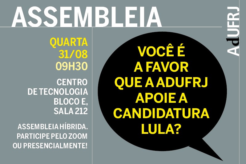 PS: Lembramos a todos os coleg@s a importância de participar de nossa próxima assembleia, quarta-feira (31), às 9h30. Queremos discutir política e colocar a AdUFRJ na luta histórica pela derrota de Bolsonaro e pela eleição de Lula.