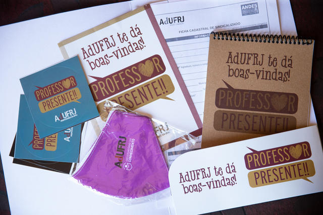 A AdUFRJ presenteou os novos professores que ingressaram na universidade. Cada um recebeu uma pasta com jornal, bloco de anotações, folder de apresentação do sindicato e seus serviços, adesivos, caneta, álcool e máscara, além de uma ficha de filiação.