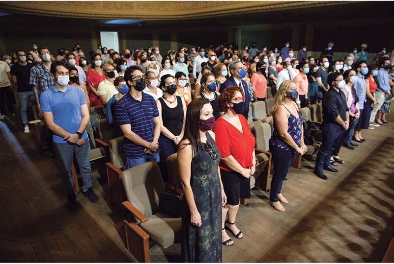 DOCENTES E TÉCNICOS celebram a posse na tradicional Escola de Música da UFRJ, na LapaObrigatórias na cerimônia presencial de novos professores e técnico-administrativos da UFRJ, as máscaras não esconderam a emoção de quem tomava posse na maior federal do país. O evento aconteceu no centenário Salão Leopoldo Miguez, da Escola de Música, no dia 30 de março. Vinte e três docentes e 51 técnicos assumiram formalmente seus cargos na universidade. Um reforço que será complementado ao longo do ano com a entrada dos aprovados nos concursos que ainda estão em andamento.