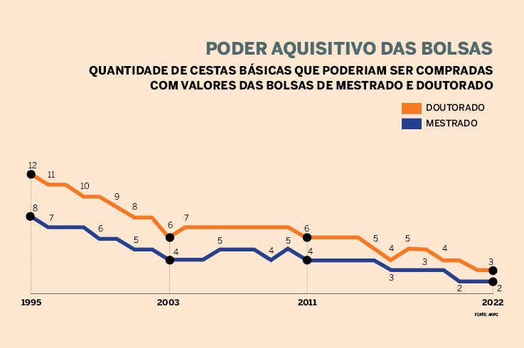 Após nove anos de congelamento, as bolsas da Capes e do CNPq atingiram, em 2022, o menor valor real em três décadas. Em 1995, um bolsista de doutorado ganhava R$ 1.073, o que correspondia a dez salários mínimos da época ou doze cestas básicas. Em 2013, o valor nominal chegou a R$ 2,2 mil, o que equivalia a quatro salários mínimos ou seis cestas básicas. De lá para cá, sem nenhum reajuste, ela vale hoje aproximadamente 1,8 salário mínimo e permite a compra de apenas três cestas básicas.