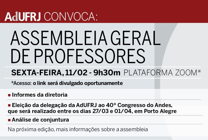 Para discutir o tema com os docentes da UFRJ, a diretoria da AdUFRJ convocou uma assembleia para 11 de fevereiro, sexta-feira, às 9h30. O encontro será realizado de maneira remota. Serão dois os principais assuntos: a participação no Congresso do Andes em março e a análise de conjuntura. “Vamos fazer a assembleia, mas não será discutido indicativo de greve, até porque o Andes não pautou isso. Vamos discutir a possibilidade de um movimento conjunto com todo o funcionalismo público e reavaliamos a situação mais perto de março”, explicou João Torres.
