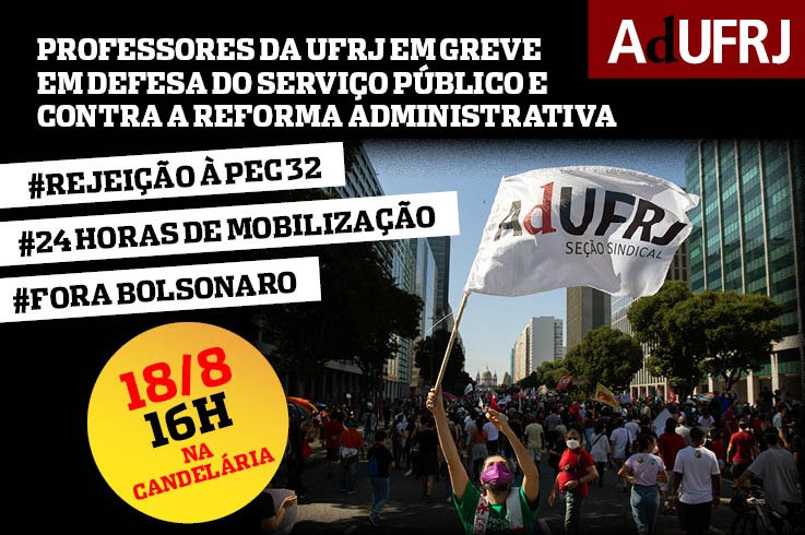 Os defensores da democracia, da universidade pública e gratuita e do Serviço Público têm agenda cheia na próxima quarta-feira (18). O dia começa com uma assembleia da AdUFRJ, às 10h, para debater a greve nacional em defesa do Serviço Público e contra a reforma administrativa, marcada para o mesmo dia. Às 16h, na Candelária, começa a concentração para o ato contra a PEC 32 convocado pelo Fórum Unificado em Defesa do Serviço Público e Estatais.