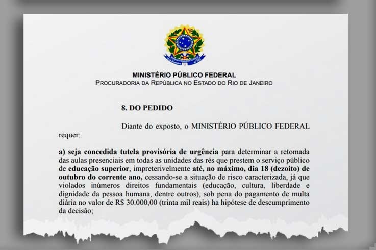 Por meio de uma ação civil pública, o Ministério Público Federal (MPF) ingressou na Justiça para que oito instituições de educação do estado do Rio de Janeiro, incluindo as universidades federais, retomem as atividades de ensino normalmente em suas instalações. O prazo máximo seria até 18 de outubro. Se houver descumprimento, o MPF sugere a aplicação de multa diária de R$ 30 mil. O caso, que provocou indignação na comunidade acadêmica, ainda não tem previsão de julgamento.