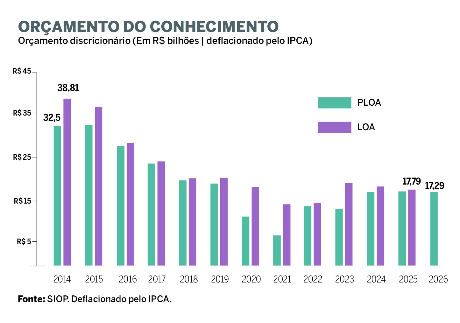 Em 2026, Capes e CNPq receberão, respectivamente, R$ 4,93 bilhões e R$ 1,57 bilhão, se não houver mudança na proposta do governo. A Capes até ganha um pouco a mais que o valor reservado na PLOA deste ano, de R$ 4,9 bilhões. Mas o CNPq sofre ligeira perda, pois a PLOA deste ano era de R$ 1,63 bilhão. Mas ambas agências ganharão bem menos que os R$ 10,83 bilhões e R$ 3,43 bilhões previstos em 2014.
