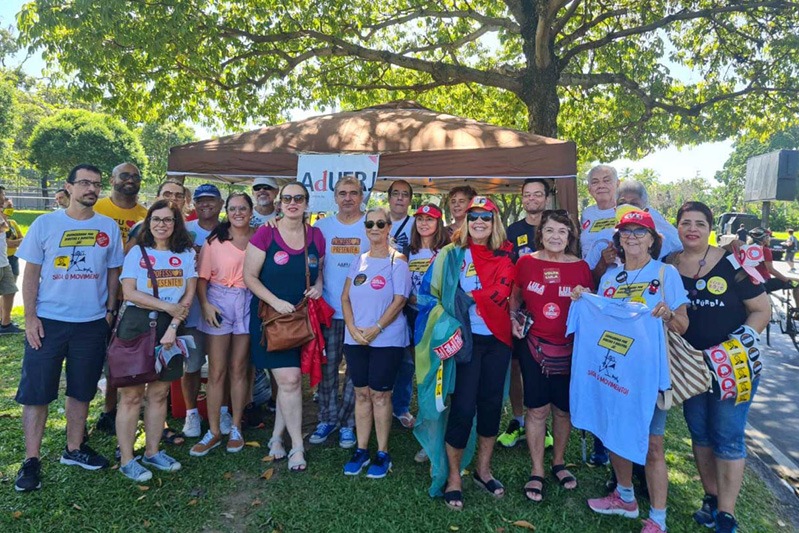 foi convocada em conjunto pelas centrais sindicais nacionais e aconteceu no Aterro do Flamengo, com pouca participação de trabalhadores, mas com longos abraços e sorrisos dos manifestantes. A AdUFRJ montou uma barraquinha com bolo, sucos, lanches e ambiente acolhedor. Os professores da UFRJ atenderam ao chamado do sindicato e marcaram presença na atividade.