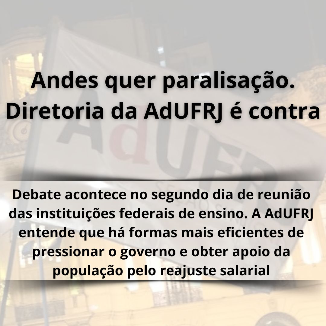 O problema é que o Andes quer marcar uma paralisação como forma de pressão. Expediente ao qual a diretoria da AdUFRJ é frontalmente contrária. "Estamos num contexto em que a gente tem a sociedade civil contra nós ainda. Bolsonaro obteve quase 50% dos votos. É uma sociedade que acha que professor não trabalha. Quando a gente faz greve, a gente se afasta da sociedade. Os nossos alunos ficam contra a gente, os outros colegas ficam contra a gente", ponderou a professora Mayra Goulart, vice-presidente da AdUFRJ.