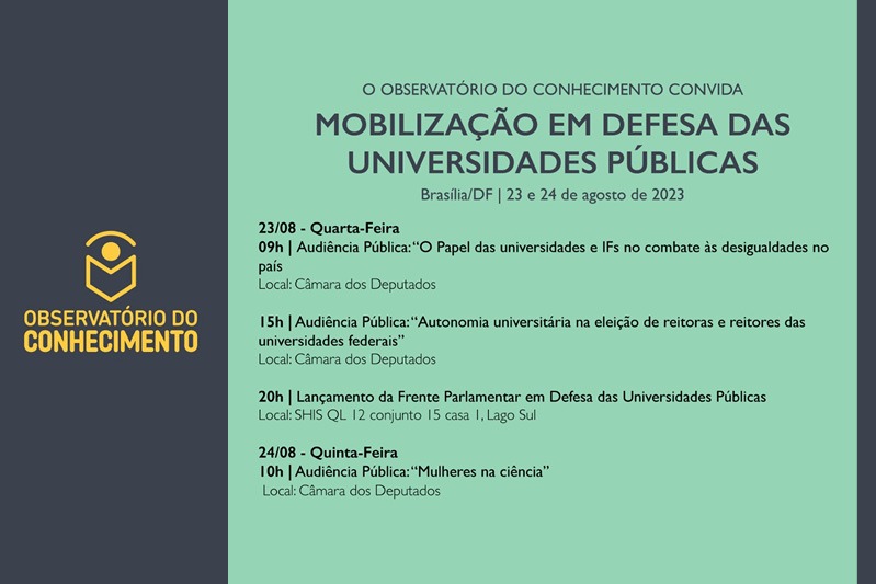 Hoje sob coordenação da AdUFRJ, o Observatório do Conhecimento vai cumprir intensa agenda em Brasília, na próxima semana. A rede de associações e sindicatos docentes vai participar de audiências no Congresso e do lançamento da Frente Parlamentar em Defesa das Universidades Públicas. Confira a seguir:
