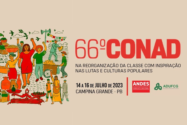 Com o tema “Na reorganização da classe com inspiração nas lutas e culturas populares”, o 66º Conselho do Andes (Conad) acontece entre os próximos dias 14 e 16 de julho, em Campina Grande (PB), com organização da Associação de Docentes da Universidade Federal de Campina Grande (ADUFCG). As plenárias ocorrerão no Centro de Eventos Rosa Tânia Barbosa de Menezes, da UFCG, em torno de três temas: Atualização do Debate sobre Conjuntura e Movimento Docente; Atualização dos Planos de Lutas dos Setores e Plano Geral de Lutas; e Questões Organizativas e Financeiras.