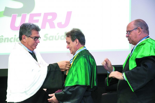 Cafezeiro, representando o segmento docente, compôs a Comissão de Honra que conduziu o professor Nelson à mesa da solenidade. Ao lado dele, estavam: a técnica-administrativa Neuza Luzia Pinto; o estudante João Roquete da Rocha; a paciente Olga Borges, do Hospital Universitário Clementino Fraga Filho; e o médico Luiz Roberto Londres, ex-aluno da UFRJ da turma da Medicina de 1965, colega de turma do mais novo emérito da universidade.