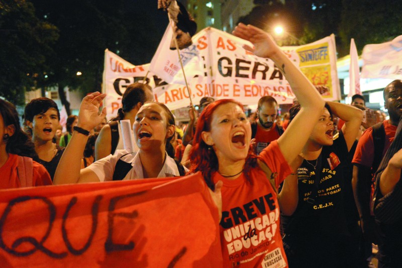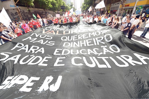 No último dia 5, servidores e estudantes caminharam juntos da Candelária até a Cinelândia. Cerca de 500 pessoas participaram da mobilização. Cantos de ironia ao megaevento esportivo foram entoados com frequência. Durante o trajeto, em uma demonstração de solidariedade às reivindicações do protesto, moradores e trabalhadores do Centro do Rio lançaram papéis picados do alto de alguns prédios. Ao chegarem à Cinelândia, os manifestantes se reuniram em frente à Câmara Municipal. A greve dos funcionários da Biblioteca Nacional, bem ali em frente, também foi lembrada nos discursos.