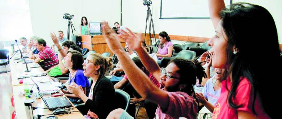 A resposta veio na hora. Maria Malta (Adjuntos do CCJE) explicitou seu descontentamento com os esclarecimentos solicitados: “Nossa discussão está indo por um caminho lamentável, que não é a construção de uma nova legislação que dê conta da realidade de nossa categoria”. Ela citou como a atual lei das carreiras prejudica os professores: “Há casos em que, depois de dois anos de extrema dedicação a essa universidade, um professor com doutorado receberá R$ 88 de progressão. Um docente levará 13 anos para ter um aumento de R$ 3.800. É isso que está regendo a nossa carreira. Ponhamos a mão na consciência”.