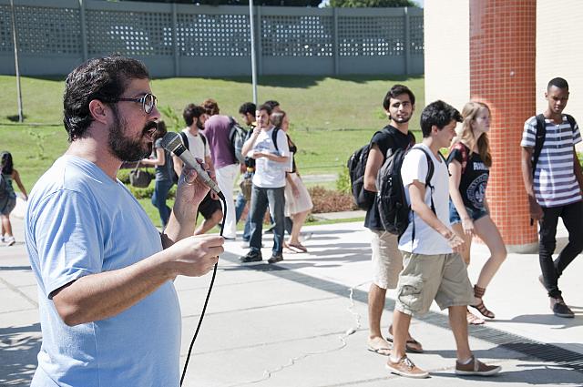 O presidente da Adufrj-SSind, Cláudio Ribeiro, manifestou sua preocupação com a presença da Polícia Militar no Fundão. “A segurança no campus tem que ter uma matriz universitária”, defendeu. O dirigente manifestou sua solidariedade aos estudantes da Educação Física e, se dirigindo à estudantada na fila do bandejão, disse que é essencial a ampliação dos espaços de participação dos estudantes nas áreas de decisão da universidade.