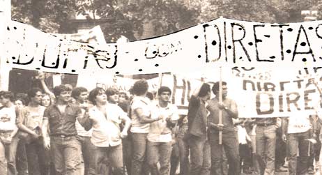 Em 1984, a Adufrj também levou faixa para as passeatas que cobravam as Diretas Já. Foto: Arquivo da Adufrj - abril de 1984A moeda era o cruzeiro. O ministro da Educação era Eduardo Portella. E quem mandava no país, substituindo Ernesto Geisel desde março, era o general João Figueiredo. A ditadura brasileira começava a viver sua fase final. Fervilhavam as greves na região do ABC paulista.