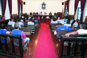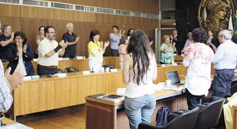 De pé. Conselheiros comemoram emerência do professor Nelson. Sua luta contra a mercantilização da Saúde foi destacada. Foto: Elisa Monteiro - 24/04/2014