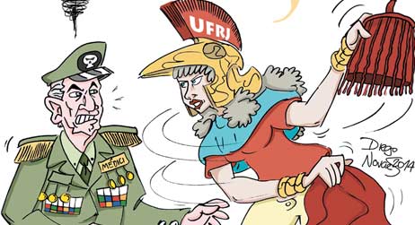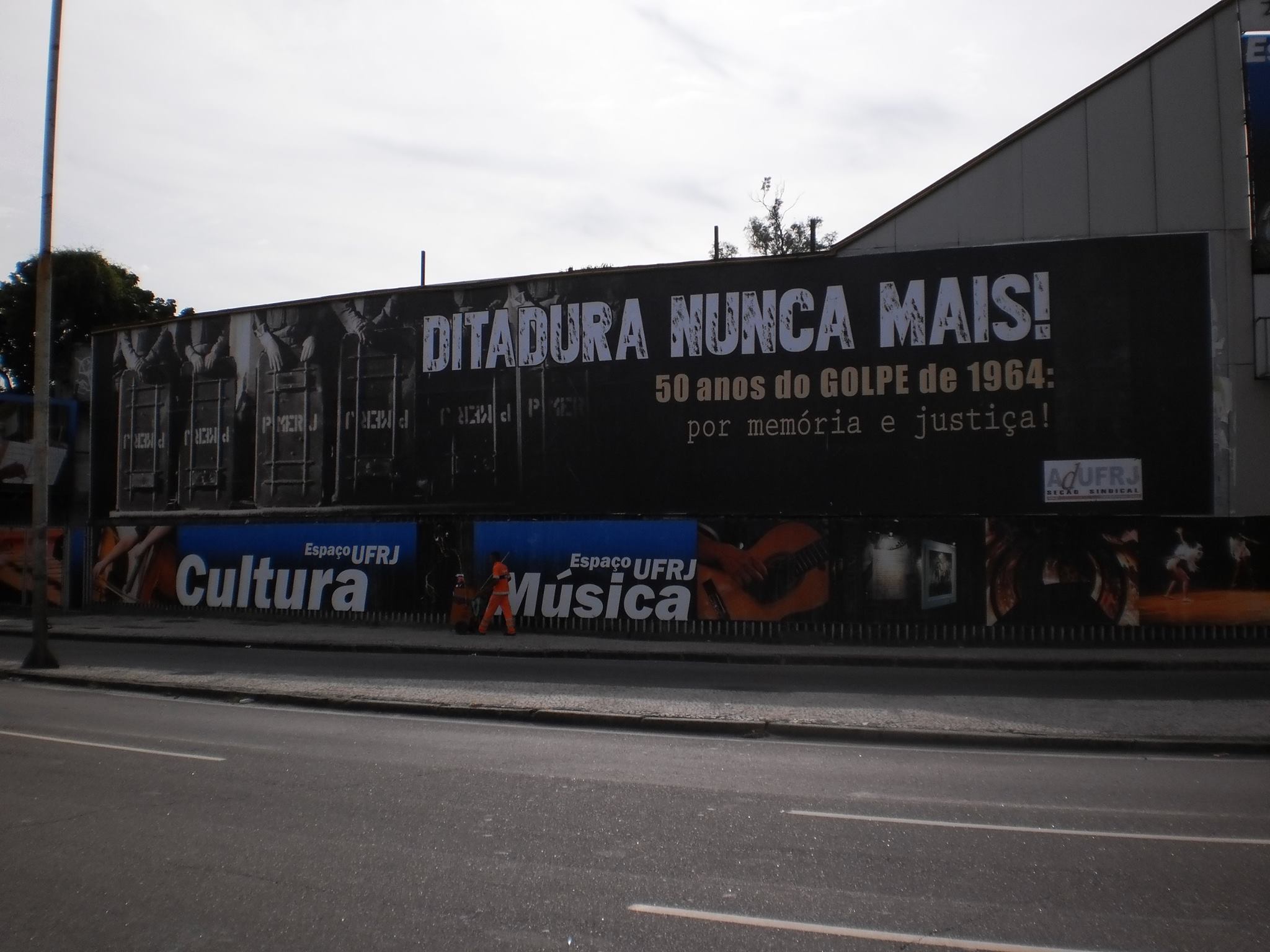 Foi instalado durante o último fim de semana o mais novo outdoor da Adufrj-SSind, na lateral do ex-Canecão. Resultado do Grupo de Trabalho de Comunicação e Artes da Seção Sindical, o painel foi ilustrado pelos professores Martha Werneck e Licius Bossolan, da EBA-UFRJ. A obra, desta vez, envolveu também Elídio Borges Marques, do Núcleo de Estudos de Políticas Públicas em Direitos Humanos. Ele é um dos integrantes da Comissão da Verdade do Andes-SN.