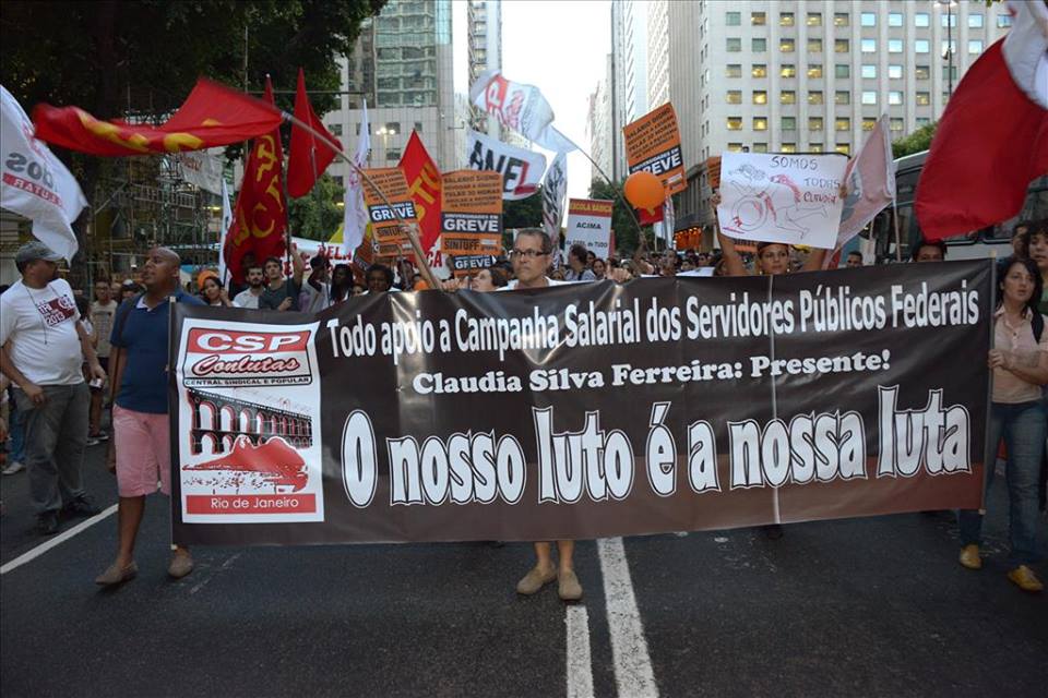 Durante o Dia Nacional de Mobilização dos Servidores Federais, o ato unificado do Rio de Janeiro, no Centro, foi marcado pelas homenagens à trabalhadora Cláudia Ferreira. Ela foi baleada em Madureira no último domingo, colocada no porta-malas de um camburão e, quando a tampa do veículo abriu, acabou arrastada por dezenas de metros na rua.