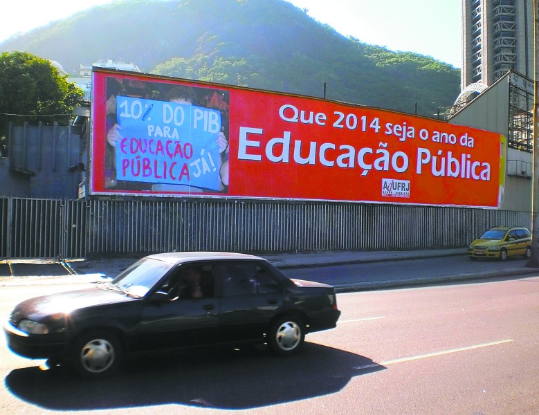 O mais novo painel instalado pela Adufrj-SSind na lateral do ex-Canecão, na Zona Sul do Rio, destaca um ponto que precisa mobilizar toda a população brasileira em 2014: a defesa e ampliação da Educação Pública.