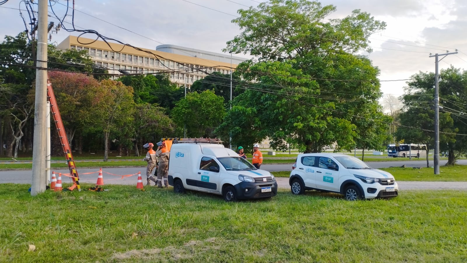 Neste momento, uma equipe da empresa percorre a Cidade Universitária cortando a energia de mais prédios. Agora, às 17h56, estão no próprio edifício Jorge Machado Moreira. Antes, cortaram a luz da Associação de Moradores da Vila Residencial (o imóvel pertence à UFRJ) e do estacionamento do instituto Coppead.