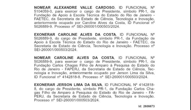 Foi publicada na edição do Diário Oficial desta quinta-feira (7) a troca no comando da Fundação Carlos Chagas Filho de Amparo à Pesquisa do Estado do Rio de Janeiro (FAPERJ). O pesquisador e professor da UFRJ, Jerson Lima, foi exonerado da presidência da instituição. Em seu lugar, o governador Cláudio Castro nomeou Caroline Alves da Costa, pedagoga e até então presidente da Fundação de Apoio à Escola Técnica (Faetec).