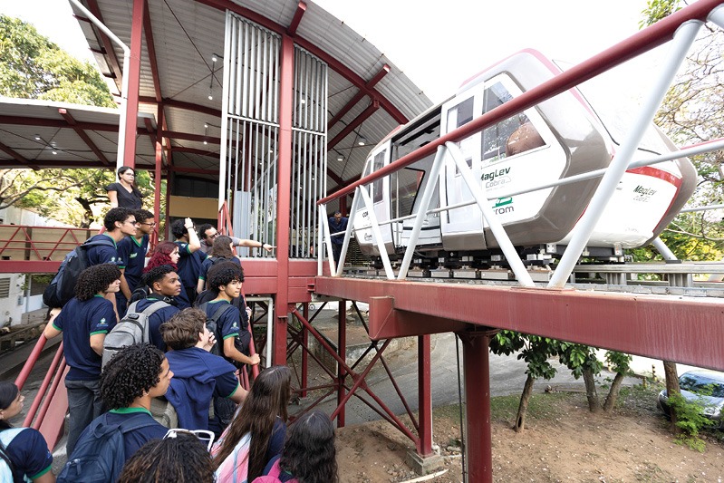 A poucos metros dali, outro grupo chegou para conhecer a nova geração do MagLev Cobra, o trem de levitação magnética desenvolvido pela Coppe. A segunda versão, ainda mais silenciosa e autônoma, está em fase final de ajustes, mas foi instalada nos trilhos onde foi possível demonstrar a flutuação do equipamento.