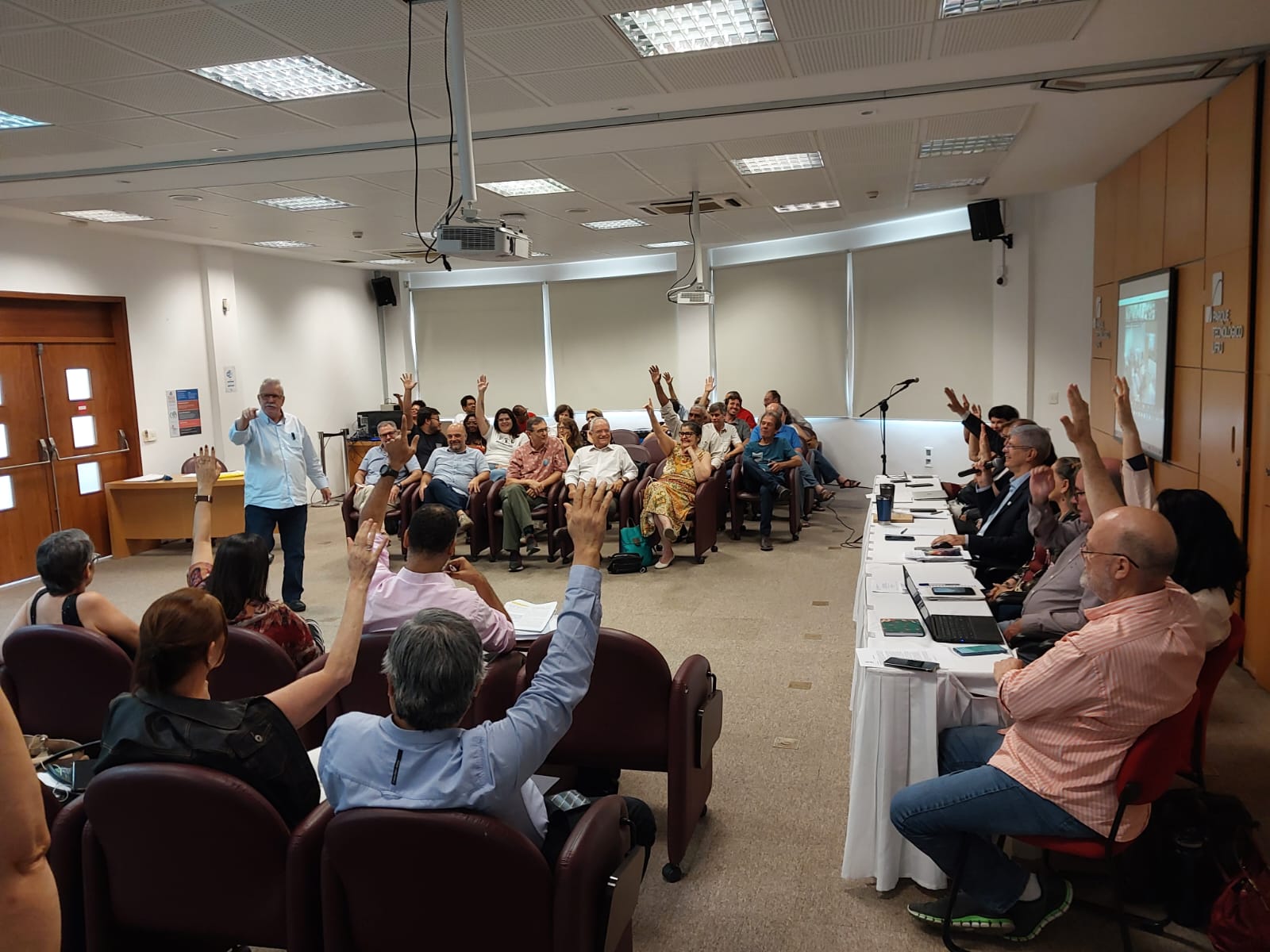 O salão do Fórum estava cheio, mas a ideia é espalhar a mensagem para o máximo de docentes. “É muito importante ter essa quantidade de pessoas aqui, mas queremos muito mais. Então avisem os colegas”, reforçou a vice-presidente da AdUFRJ, professora Nedir do Espirito Santo.