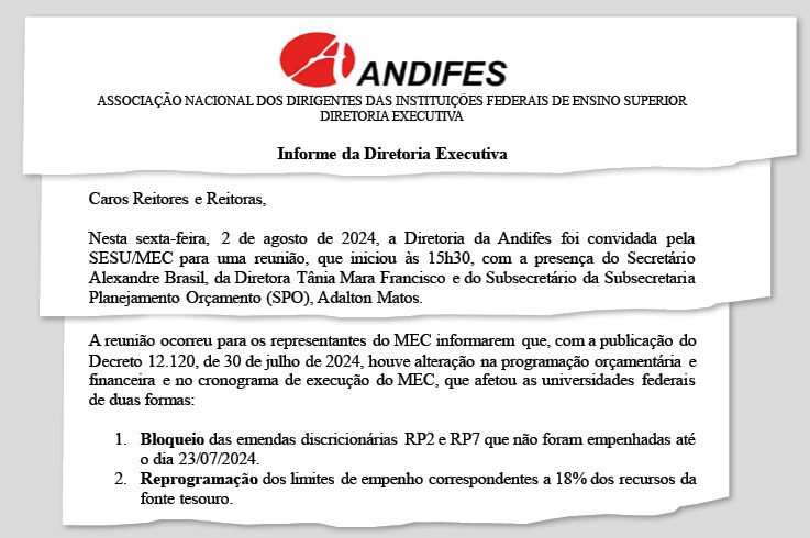 A entidade afirma estar em “constante diálogo” com a Secretaria de Educação Superior (SESu) e a Subsecretaria de Planejamento e Orçamento (SPO) tanto em relação ao orçamento de 2024 quanto o do próximo ano.