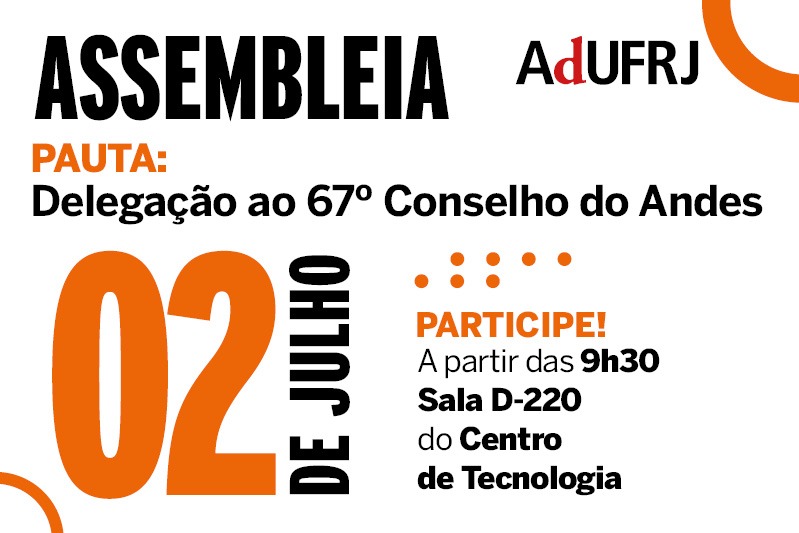 Uma assembleia nesta terça-feira (2), às 9h30, define a delegação da AdUFRJ ao 67º Conselho do Andes (Conad). A reunião será realizada na sala D-220 do Centro de Tecnologia.