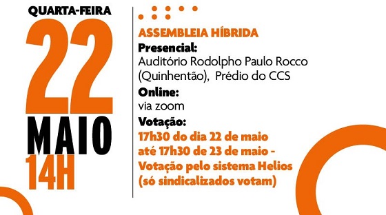 A AdUFRJ convoca assembleia geral para quarta-feira, 22 de maio, às 14h, em formato híbrido. A opção presencial ocorrerá no Auditório Rodolpho Paulo Rocco (Quinhentão), Av. Carlos Chagas Filho, 373, Bloco K - Prédio do CCS, onde estará a mesa diretora. A presença na assembleia também pode ocorrer por meio da plataforma Zoom. Os docentes sindicalizados já receberam o endereço eletrônico.
