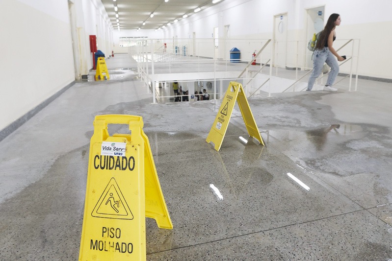 As chuvas também são um tormento. Com telhados jamais reformados, os três blocos sofrem com persistentes infiltrações. Em um dia de sol — e mesmo sem ter chovido na véspera —, a reportagem constatou várias goteiras. Paredes estufadas, amareladas pela umidade, estão por toda parte, assim como as poças pelos corredores. Um temporal já inviabilizou as aulas, em março deste ano.