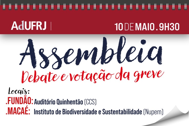 A presidenta Mayra Goulart informou que a assembleia geral dos docentes acontece na próxima sexta-feira, dia 10. Será multicampi, com participação presencial do Fundão e de Macaé. A votação será em urna, nos locais de assembleia. Haverá duas votações. A primeira será sobre a entrada ou não em greve. Em caso de os docentes decidirem contra a greve, eles deverão escolher pela entrada em estado de greve ou permanência em estado de mobilização.
