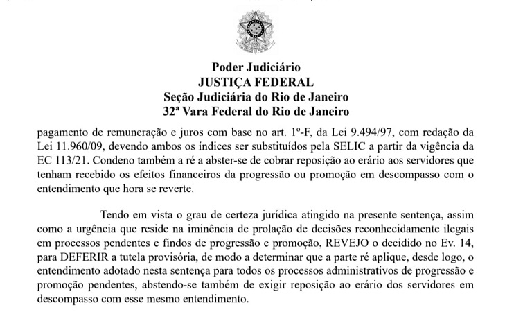 O juiz estabeleceu, ainda, a tutela provisória da matéria, ou seja, o cumprimento imediato da sentença para todos os processos administrativos de progressão e promoção docentes já em curso e que ainda estão pendentes na UFRJ. Além disso, ordena que a universidade não exija que os professores devolvam eventuais recursos ao erário.