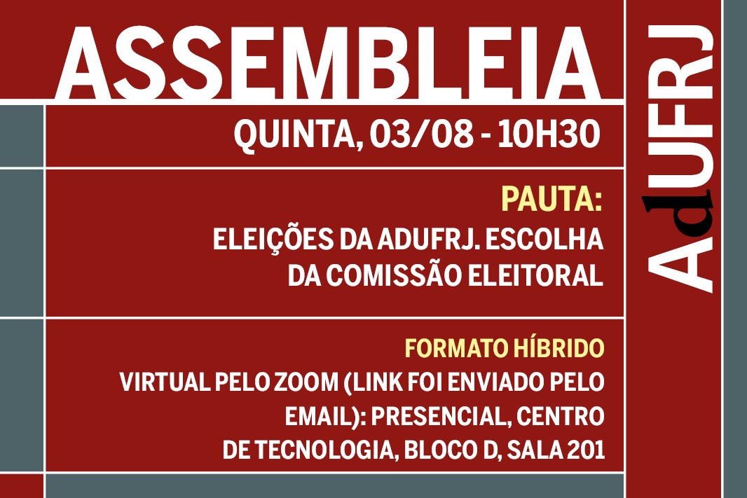Na quinta-feira (dia 3), às 10h30, uma assembleia geral vai escolher a comissão responsável pelas eleições para a diretoria e Conselho de Representantes da AdUFRJ, biênio 2023-2025. O formato da reunião será híbrido: presencial, no Centro de Tecnologia, bloco D, sala 201; e virtual, através do Zoom (o link foi enviado por email). Participe!