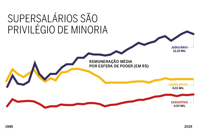 Na outra ponta, o cenário é bem diferente. O Atlas do Estado Brasileiro indica que a remuneração média dos servidores varia de forma significativa entre os níveis federativos e os poderes. Na esfera federal, enquanto a remuneração média no Executivo é de R$ 4 mil e de R$ 6 mil no Legislativo, ela chega a R$ 12 mil no Judiciário. Os dados são de 2019. O quadro é similar nas esferas estadual e municipal.