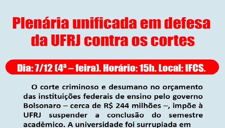 A plenária também contou com a presença de representantes da UFF, da UniRio e do Colégio Pedro II, que expuseram os impactos dos cortes de verba em cada instituição. Há atrasos de bolsas, problemas na frota intercampi e ameaça à merenda escolar.