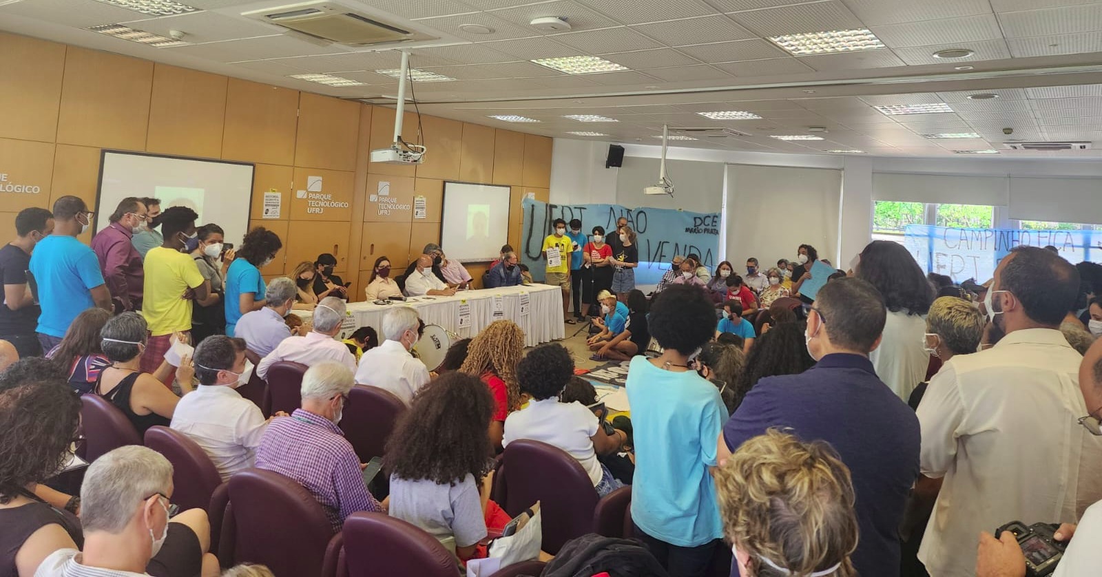 Com 38 votos favoráveis, 7 contrários e 2 abstenções, o colegiado máximo da UFRJ aprovou nesta quinta (17) o parecer que autoriza o uso do terreno onde se situa o campo de futebol da Praia Vermelha para a construção do novo equipamento multicultural da universidade. A reunião foi tensa, com seguidas interrupções realizadas pelos estudantes que protestavam contra o projeto. A ideia é devolver à cidade um espaço de cultura mais moderno e adequado às necessidades dos setores artísticos da sociedade e da universidade. O Conselho Universitário precisou ser encerrado antes da hora, por conta das intensas manifestações políticas que interditaram a sessão após a proclamação do resultado.