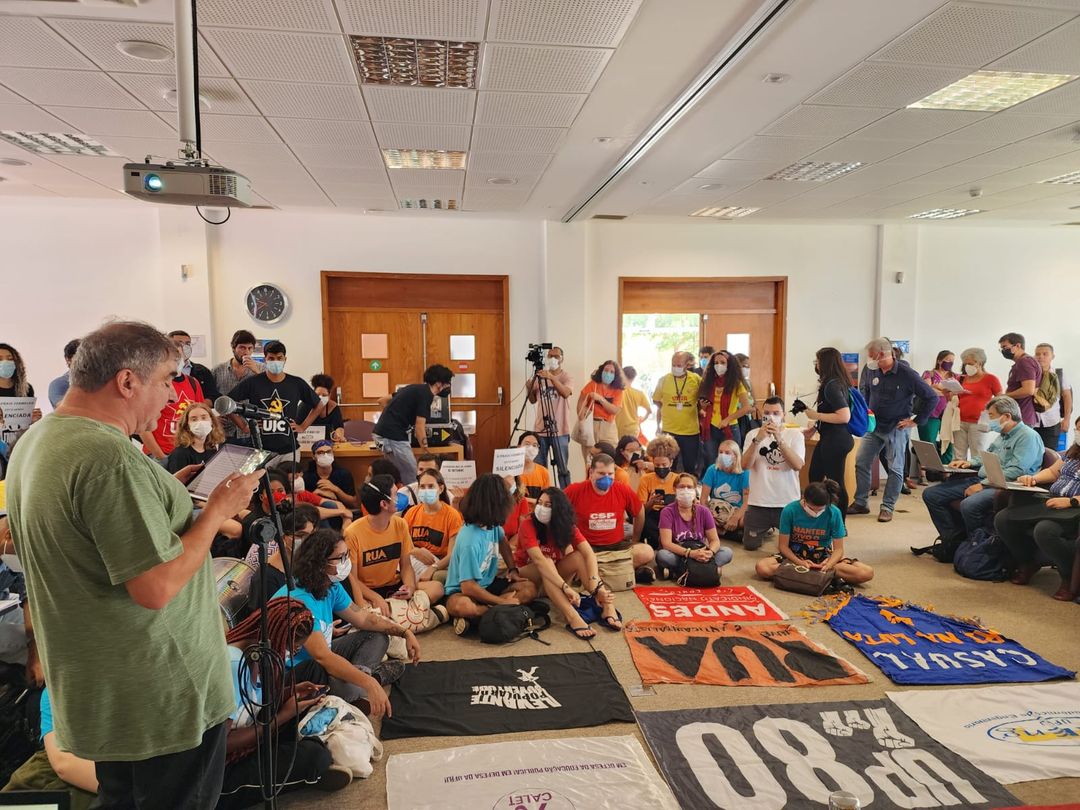 O clima de intimidação já estava posto desde antes do começo da sessão, quando alguns interventores se colocaram na porta do auditório, dificultando a entrada dos conselheiros/as. Em seguida, com alguns minutos de sessão iniciada, houve a "invasão" prometida durante a semana, com ~50 interventores adentrando a sala com tambores, bumbo e muitas palavras de ordem. A partir daí tivemos um espetáculo deplorável de desrespeito às normas e constrangimento democrático: ofensas pessoais à reitora, silenciamento de falas favoráveis ao projeto de revitalização e, mais grave, um "ataque" à mesa para impedir uma das votações, levando a interrupção da sessão por ~20 minutos. Graças à enorme confusão causada pelos interventores, a sessão se encerrou às 14 h (tendo começado às 9:30 h) sem que se pudesse votar qualquer encaminhamento.