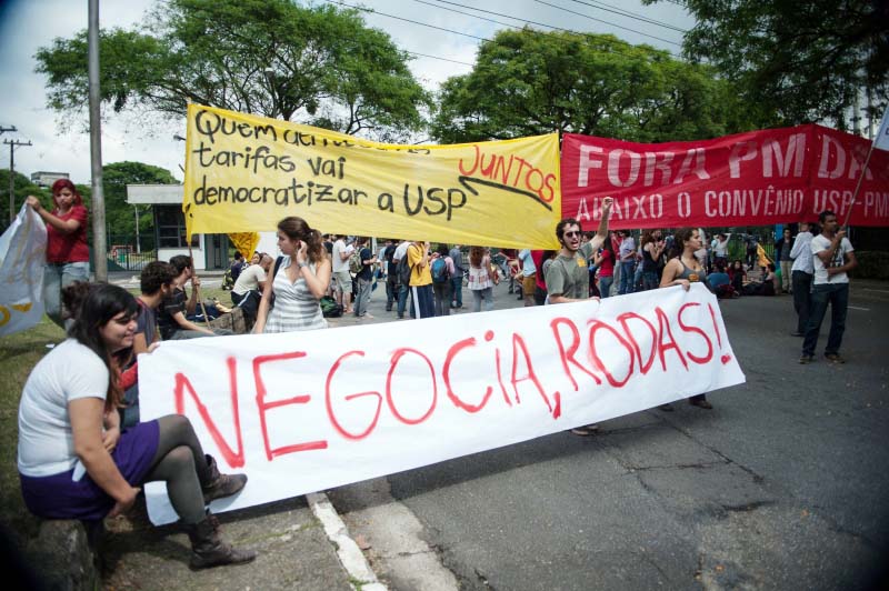 Estudantes da Universidade de São Paulo (USP), em greve, bloquearam por algumas horas dois portões de acesso do campus do Butantã, na zona oeste, dia 18. O ato foi uma forma de pressionar o reitor João Grandino Rodas a atender a pautas como eleições diretas para reitor e o fim do convênio da USP com a PM.