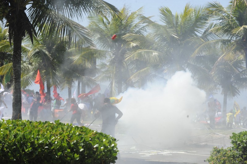 A confusão começou depois que manifestantes derrubaram a grade que separava o protesto dos homens da Força Nacional. Os policiais reagiram com balas de borracha, spray de pimenta e bombas de efeito moral. Dois feridos estão sendo atendidos em uma ambulância do Corpo de Bombeiros que está no local.