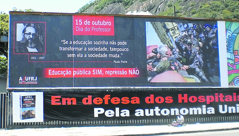 O mais novo painel da Adufrj-SSind na lateral do ex-Canecão faz uma homenagem ao Dia do Professor (15 de outubro). E também critica a recente repressão policial aos educadores em greve no Rio de Janeiro. Uma citação do Patrono da Educação brasileira, Paulo Freire (1921-1997), completa o quadro: “Se a educação sozinha não pode transformar a sociedade, tampouco sem ela a sociedade muda”.