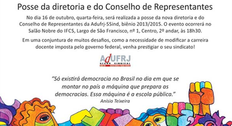 Desta vez, a arte da Adufrj-SSind ocupa a metade daquele espaço. A outra parte será utilizada para divulgação de um evento da pró-reitoria de Extensão da UFRJ.