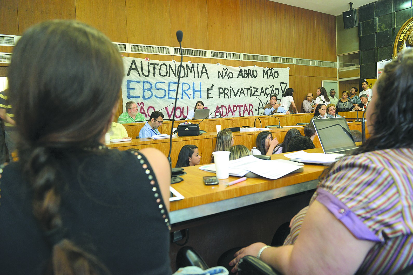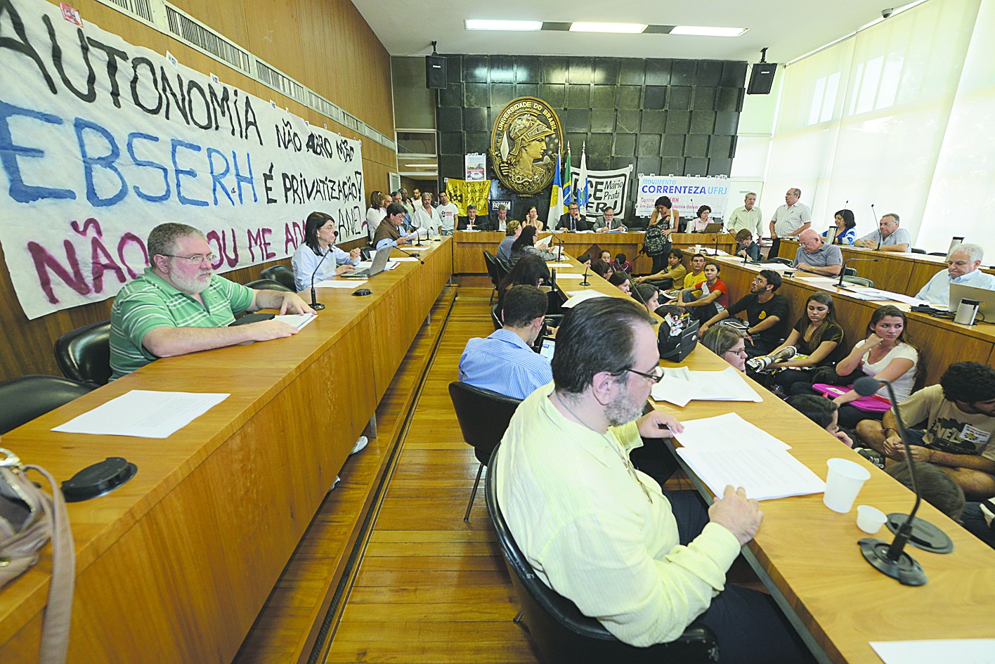 Havia a expectativa em torno da apresentação dos relatórios dos especialistas que investigaram as unidades de saúde da UFRJ por dois meses. Mas, para quem esperava um quadro detalhado da situação dos hospitais universitários e indicações para sua gestão pública e autônoma, a sessão do Consuni do dia 22 não correspondeu. Os documentos dos grupos técnicos dedicaram-se quase que exclusivamente à análise dos termos da proposta de contrato apresentado pela Empresa Brasileira de Serviços Hospitalares (Ebserh), modelo privatizante do governo para administrar os HUs. A linha “empresa é a única opção” criou embaraços e dividiu opiniões.